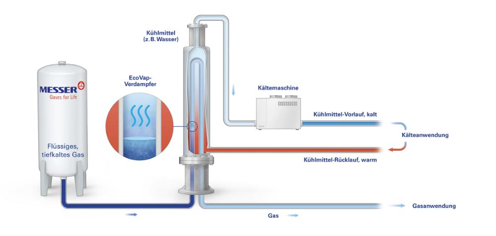 If gas is required in the production process, it does not pass via the conventional air evaporator which delivers the cold to the ambient air, instead it goes through the Ecovap evaporator. The energy required to evaporate the liquefied gas is removed from the coolant, thereby cooling down, thus relieving the refrigeration system. Ice and mist formation on the air vaporizers are not happening anymore and the temperature of the required gas is always constant regardless of the ambient conditions.