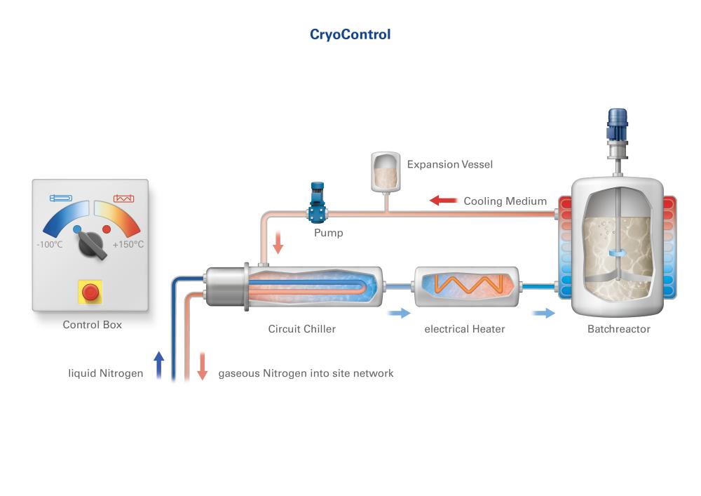 This cryo cooling system uses the cooling energy of liquid nitrogen. The principle of the process is simple but efficient: a cryogenic heat exchanger with an intermediate heat transfer medium circuit is interposed between the source of cooling energy, nitrogen, and the reactor. This circuit enables the reactor to be both cooled and heated. In cooling mode the heat transfer circuit is cooled using liquid nitrogen inside the cryogenic heat exchanger. The nitrogen can subsequently be used in gaseous form for other applications, e.g. for inerting. During the cryogenic cooling the low temperature difference between the cooling medium and the product means that the reactor contents are heated and cooled very gently and evenly. This allows the synthesis of temperature-sensitive products.