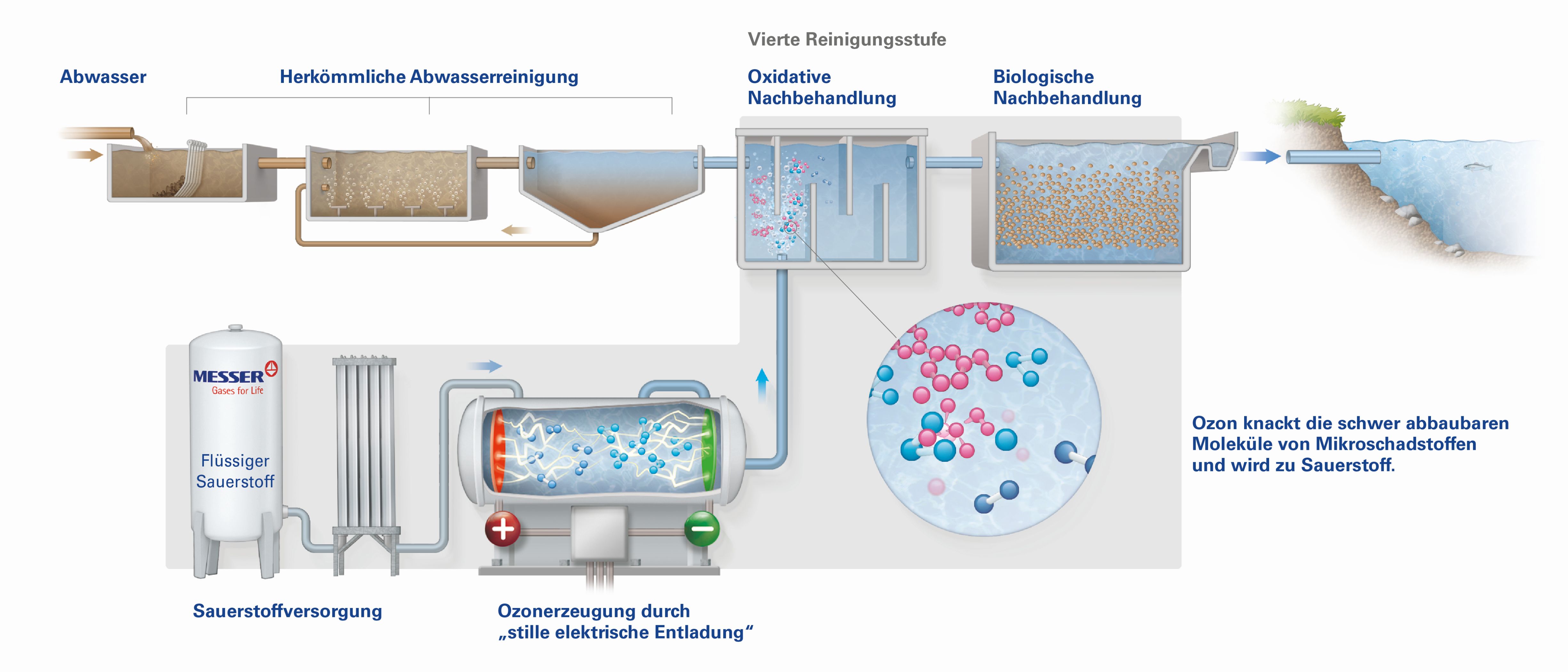 Das starke Oxidationsmittel Ozon eliminiert viele problematischen Substanzen vollständig oder aber oxidiert diese so weit, dass sie anschliessend biologisch abbaubar sind. Eine ergänzende Behandlung mit Ozon wird manchmal vor und häufig nach der biologischen Reinigung durchgeführt.