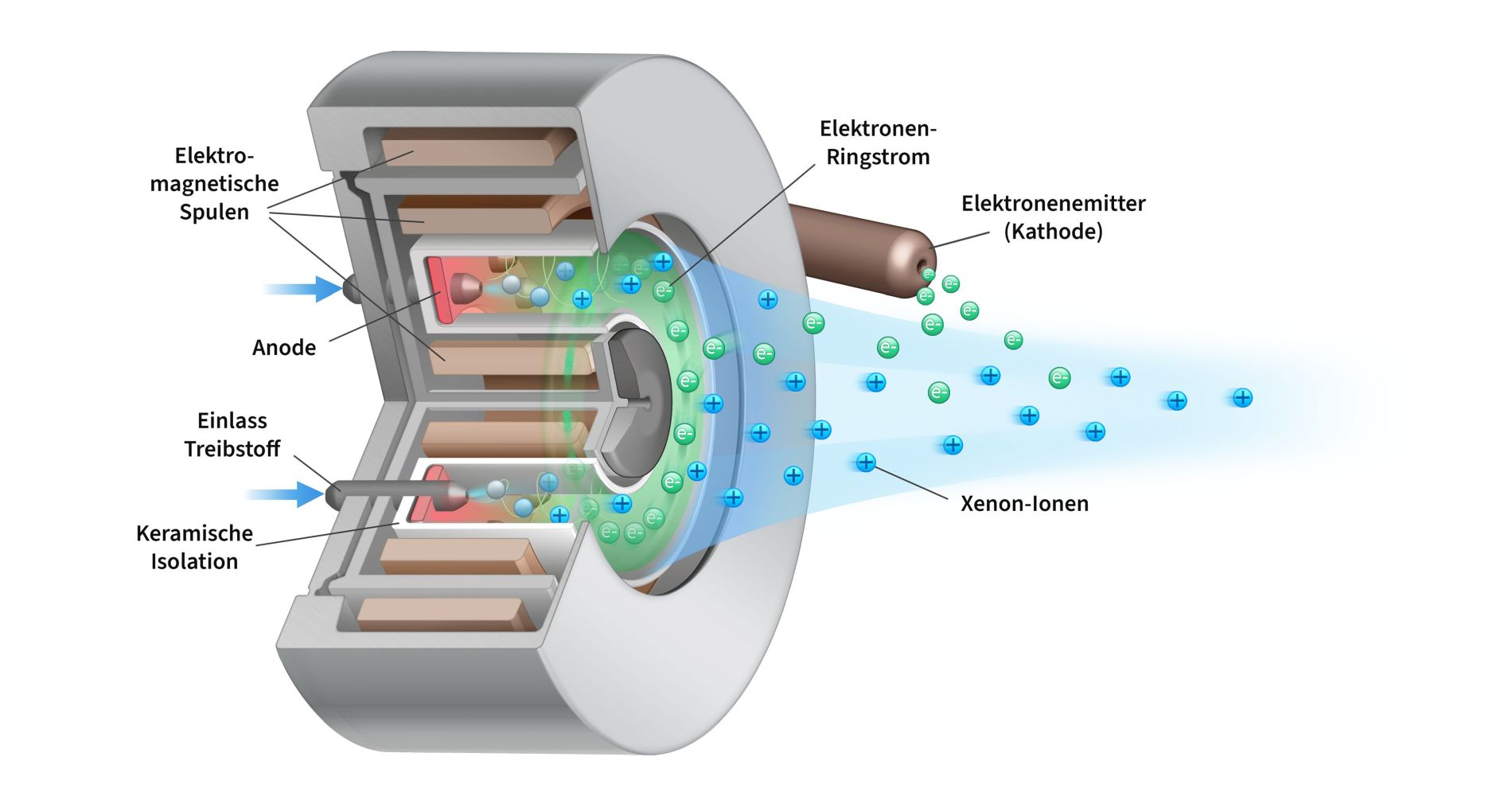 Sobald ein Xenon-Atom mit einem Elektron zusammenstösst, wird es ionisiert und durch das elektrische Feld in Richtung Triebwerksausgang beschleunigt. Der daraus resultierende Rückstoss erzeugt einen Schub, welcher den Satelliten antreibt. Die ausgestossenen Ionen bilden mit weiteren Elektronen aus dem Emitter ein elektrisch neutrales Plasma, was einen effizienten Betrieb von Satelliten und Raumsonden im Weltraum ermöglicht.