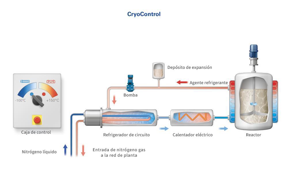Este sistema de refrigeración criogénica utiliza la energía fría del nitrógeno líquido. El principio del proceso es sencillo pero eficaz: se interpone un intercambiador de calor criogénico con un circuito de medio de transferencia de calor intermedio entre la fuente de energía fría, el nitrógeno, y el reactor. Este circuito permite tanto enfriar como calentar el reactor. En el modo de refrigeración, el circuito de transferencia de calor se enfría con nitrógeno líquido dentro del intercambiador de calor criogénico. Posteriormente, el nitrógeno puede utilizarse en forma gaseosa para otras aplicaciones, por ejemplo, para la inertización. Durante la refrigeración criogénica, la baja diferencia de temperatura entre el medio refrigerante y el producto hace que el contenido del reactor se caliente y se enfríe de forma muy suave y uniforme. Esto permite la síntesis de productos sensibles a la temperatura.