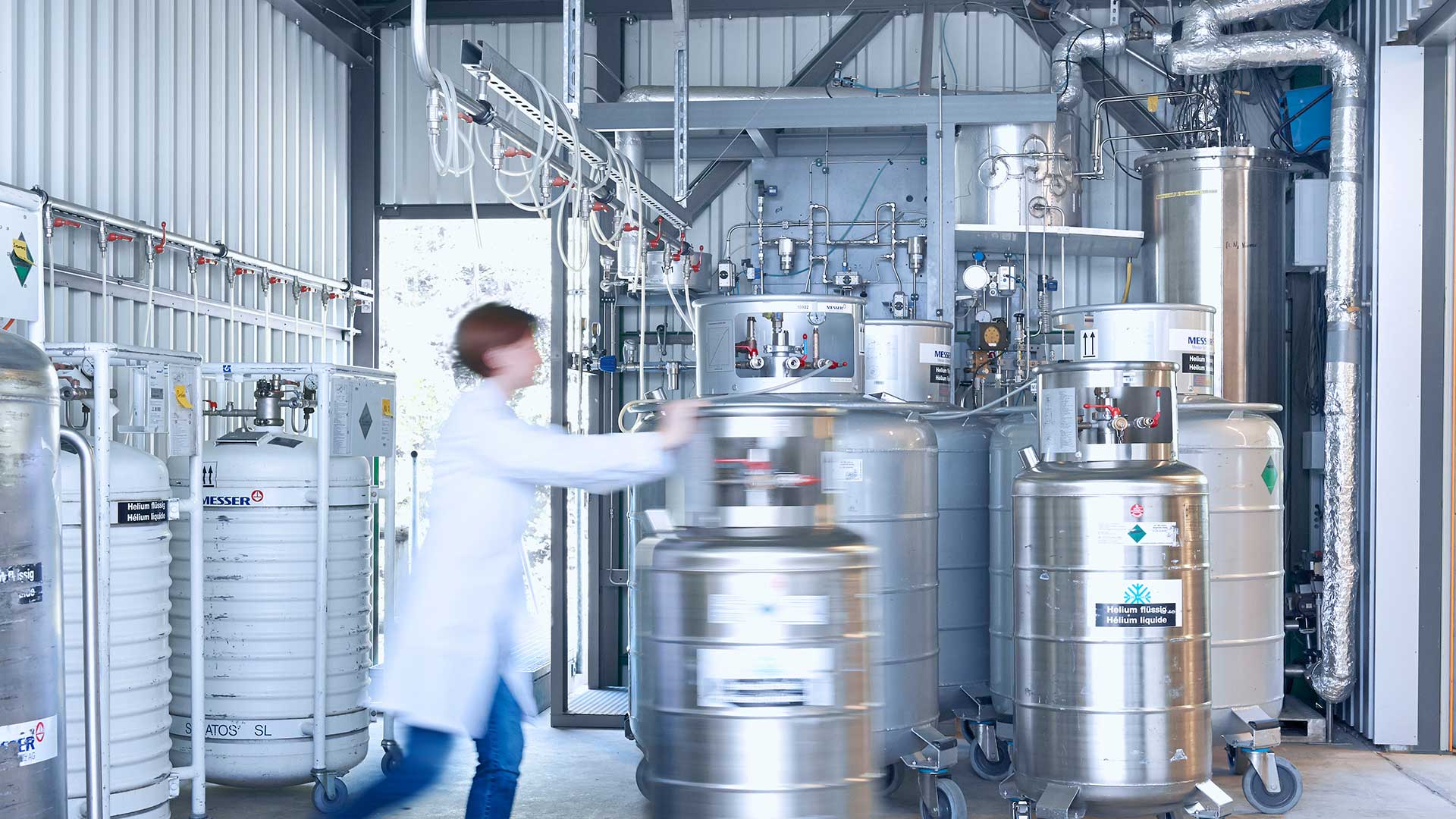 - Helio líquido - el agente refrigerante para conseguir temperaturas extremadamente bajas, p.ej. para RMN o IRM