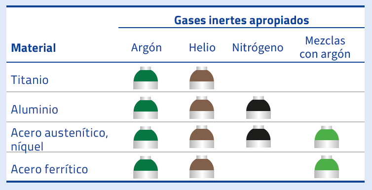 Dependiendo del proceso específico, la impresión de un componente implica el uso de gases protectores, gases portadores y/o gases de refrigeración. En la mayoría de los procesos de impresión, el tipo de gas necesario, y su pureza, depende del material. La siguiente tabla ofrece una visión general de los posibles gases protectores. También se necesitan gases para el tratamiento posterior de los componentes. Esto se realiza mediante un tratamiento térmico posterior diseñado para lograr propiedades homogéneas en los componentes o mediante un proceso de sinterización posterior. El recocido para eliminar tensiones, un proceso que requiere el uso de un gas de protección, es el tratamiento térmico típico. Pero también pueden ser necesarios otros tipos de tratamiento térmico.